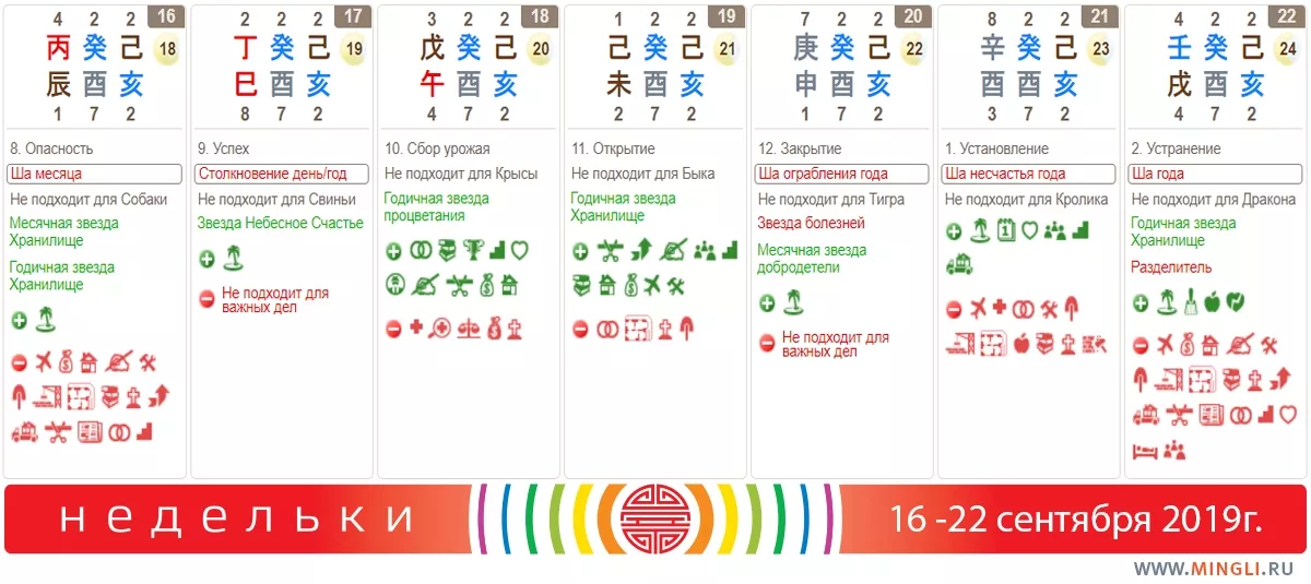 21 сентября, суббота. Подходит для планирования, обсуждений и предварительных договоренностей. Постарайтесь проявлять осторожность, чтобы не травмироваться. В час Дракона (все, кроме Кроликов) могут прогуляться на северо-восток: энергии направления поддерживает рост благосостояния и прогресс во всех делах.