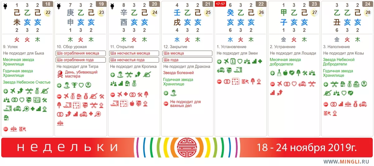 24 ноября, воскресенье. Наполните выходной приятными моментами: прогуляйтесь, понежьтесь под солнышком, если оно появилось на небе, сходите в баньку. Можно встречаться и договариваться, особенно в час Петуха (не подходит Козам и Иньским Деревьям). Если хотите помириться, простить или наладить отношения - то в этот час стоит погулять в южном направлении, лучше в одиночестве.