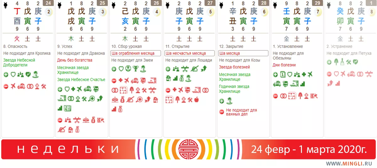 24 февраля, понедельник. Подходит для начала нового бизнеса и проектов, встреч на высоком уровне, свиданий, помолвок и даже расставаний, если вы хотите покинуть друг друга тихо и нежно. Прогуляйтесь в час Козы на юго-восток, попросите помощи Неба для ваших начинаний, особенно если вам нужна поддержка. (Увидеть надо детей или радостную женщину в зеленом, тоже с ребенком. Прогулка не подойдет тем, кто родился в день или год Кролика). День не годится для занятия экстремальными видами спорта. Если вам полезен огонь, сегодня можете попробовать рискнуть, но не всем, что у вас есть.