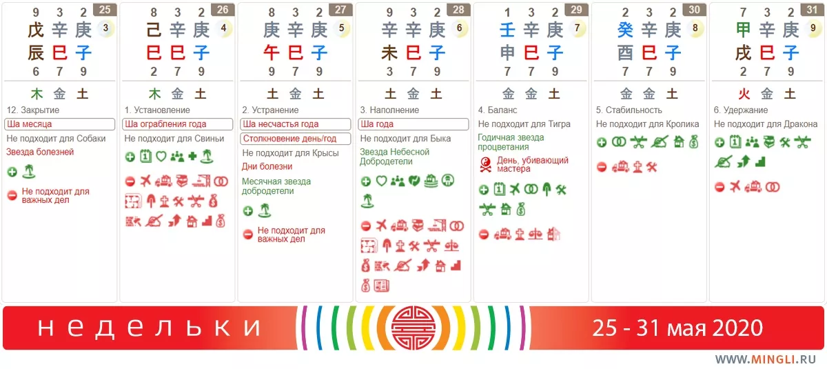30 мая, суббота. Хороший день, так же, как и предыдущий он подойдет для решения финансовых вопросов, особенно для людей слабой Воды. Да и для большинства позитивных дел он годится. В час Дракона или прогуляйтесь на северо-запад, или же поставьте здесь горящую свечу на 2 часа. Задач можно решить много: решение конфликтных ситуаций, поиск медицинской помощи или отношений, богатства или повышения по службе. Не годится для рожденных в год день Кролика.