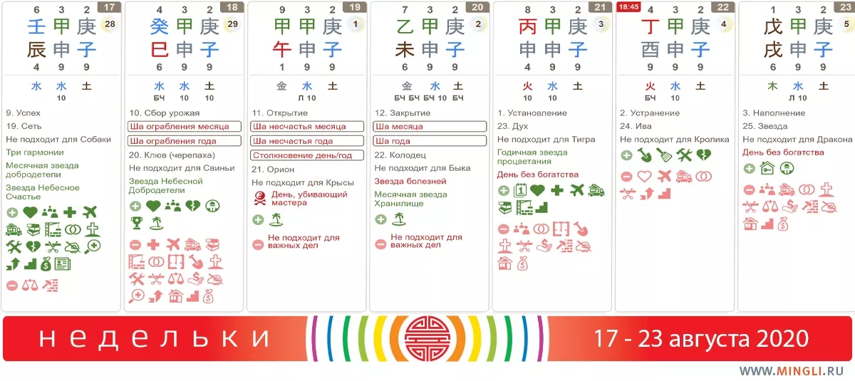 19 августа, среда. Индикатор Открытие - хороший, но дню не повезло - он столкнулся с годом и стал конфликтным, хотя столкновение и сглажено. Также ша несчастья вносит свои коррективы, поэтому особо важных дел планировать не стоит. Берегите здоровье, не занимайтесь экстримом. Сегодня не рекомендуется делать измерения для фэн шуй, поэтому, коллеги - отдыхаем!
