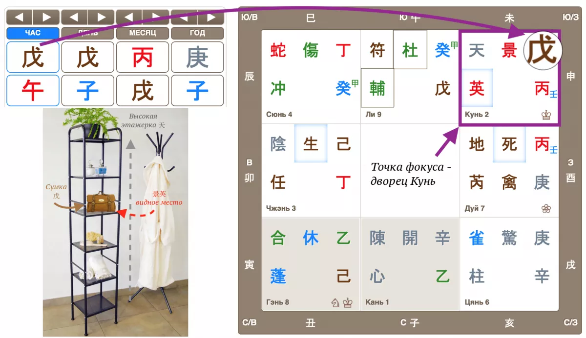 У нашей студентки возник вопрос о пропаже, пропала вещь! Где искать потеряшку? Построен расклад, в таблице расклада найден Небесный ствол часа . Это и будет пропавшая вещь. «Ага!» – это дворец Кунь, юго-запад.