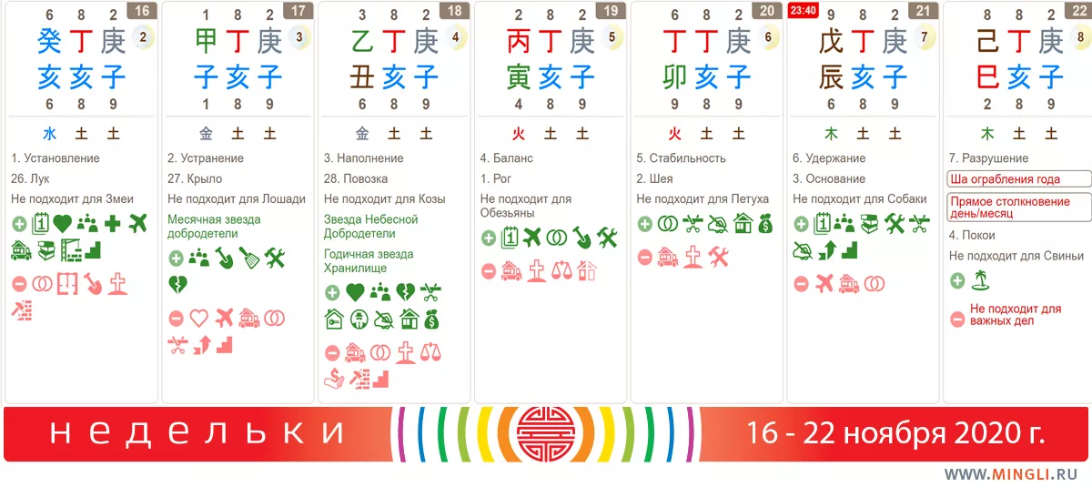 18 ноября, среда. Отличный день. Тройка зимних животных - Бык, Крыса и Свинья - собрались в сторону воды, так что опять денек для тех, кому хороши вода и дерево. Подходит среда практически для любых позитивных дел, особенно тех, которые вы хотите делать чаще. Хорошая идея - переговоры, можно также покупать что-то ценное, собирать долги.