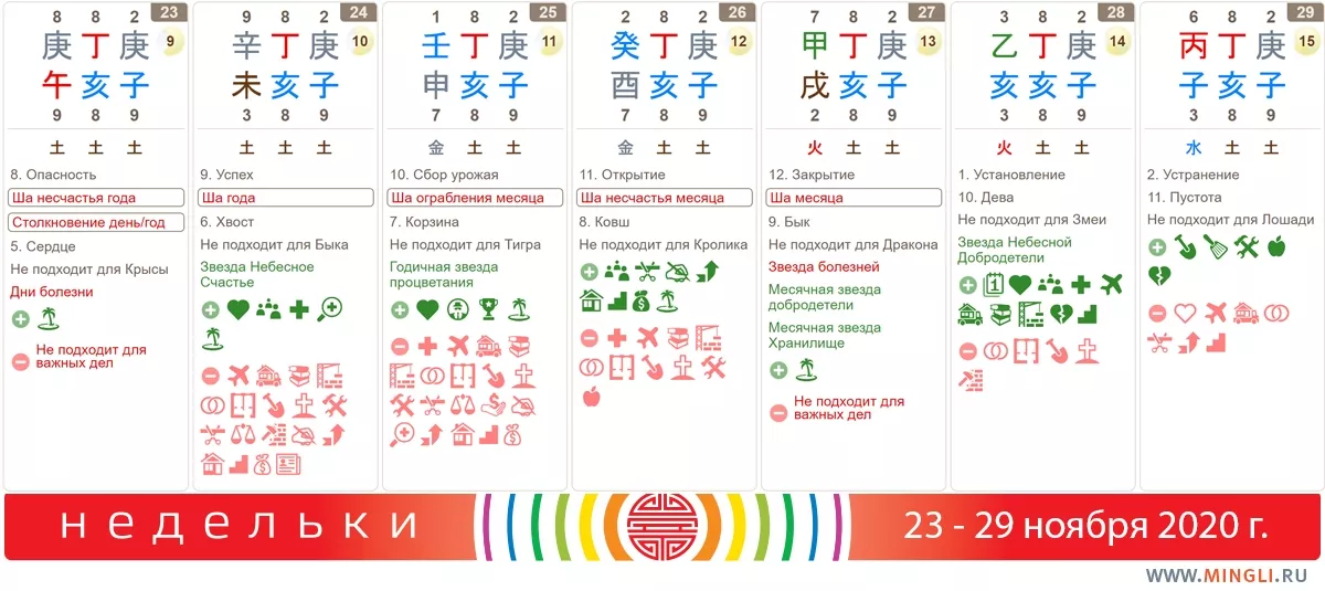 23 ноября, понедельник. Неделька начинается с отдыха. А что, бывает) Мало ли, не успели отоспаться на выходных. Если без шуток, то лучше планировать на понедельник только повседневные дела - никаких важных решений, встреч и действий, Особенно Крысам или тем, у кого в карте бацзы есть парочка Крыса-Лошадь. Также не рекомендуется ходить в поликлиники, больницы, места скопления людей или начинать лечение. Экстремальный спорт не приветствуется также.