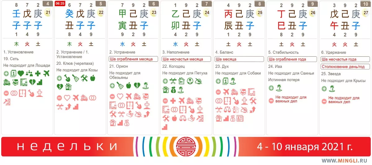 4 января, понедельник. Все хорошо, только учтите большое количество воды: собралось вместе аж три Крысы. Если вода вам полезна - все отлично. Но если нет или же в карте бацзы есть Лошади (особенно, в году) - проведите день спокойно. Он, в принципе, больше подходит для переговоров и общения, чем для активных действий.