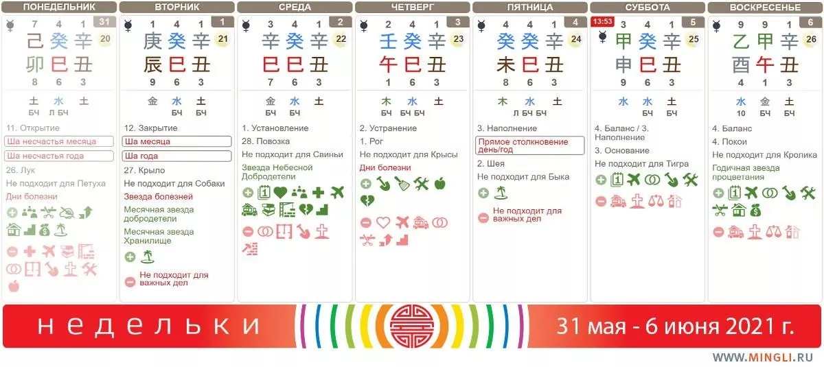 5 июня, суббота. Смена месяца, начинается Деревянная Лошадь. Во сколько сменится месяц в вашем городе, вы можете посмотреть в календаре на сайте Минли. Обычно ци таких дней считается немного суматошной, нестабильной, поэтому по поводу результатов лучше заранее расслабиться. Финансовыми вопросами лучше не заниматься, они решатся не в вашу пользу. Янским Деревьям и Огням по дню рождения стоит поберечь здоровье.