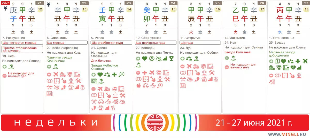 23 июня, среда. Хороший день с парочкой нюансов. Во-первых, пара дней воды пригодятся тем, кому она благоприятна. Но, с точки зрения силы день, хоть и Успех, не особенно силен: идет сезон Огня и Вода слабовата. Второй момент: сегодня не стоит подписывать важные документы и решать финансовые вопросы - можете потратить больше, чем планировали. Ну и в-третьих, не стоит посещать медицинские центры и места скопления народа. А так день подойдет для встреч, переговоров (не о деньгах), свиданий.