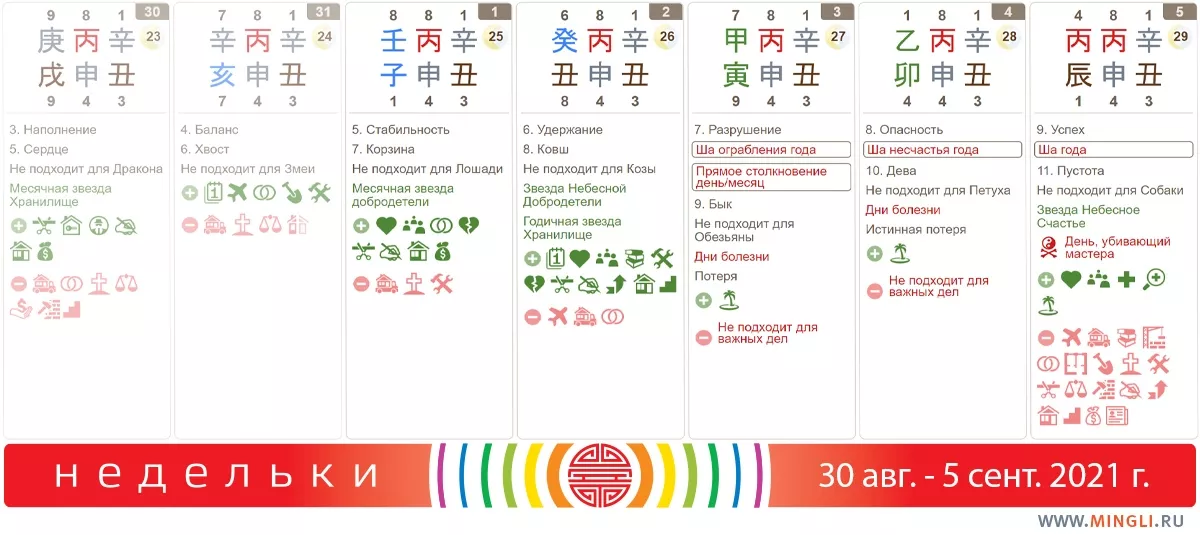 4 сентября, суббота. Также не подойдет для серьезных начинаний, продолжая тенденцию вчерашнего дня. Слишком уж Дерево слабо в сезон Металла. Сегодня, как и вчера, не стоит посещать людные мероприятия, поликлиники, мед.центры. Ну и для экстремальных видов спорта день не подходит, особенно, если в вашей карте бацзы есть противостояние Дерева и Металла. Так что лучше всего провести субботу дома, делая что-нибудь полезное.