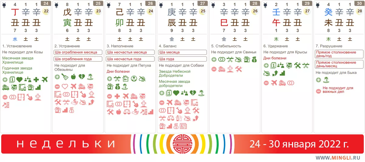 24 января, понедельник. Если вам полезен Огонь (или вы сами слабый Иньский Огонь) и вам захочется денег, скажите себе «только не сегодня!». Сил не хватит, лучше подождать хорошего периода, он уже близко. Лучше посвятите день планированию. Подойдет понедельник также для ценных приобретений, переговоров, встреч и общения; но вот окончательные решения лучше не принимать и документы не подписывать. Ремонт начинать можно (но не тревожьте центральный дворец), перестановки делать - также не возбраняется. Козам (а также тем, у кого Коза есть в карте) рекомендуется провести день мирно и спокойно.