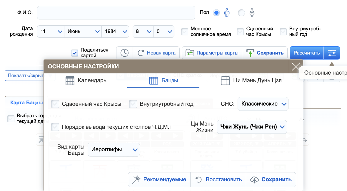 В Китае параллельно друг другу развивалось много разных школ бацзы. Они делятся на две группы – те, кто используют солнечно-лунный календарь и те, кто считает бацзы по лунному календарю. У нас в калькуляторе реализована версия с солнечно-лунным календарем. Эта школа считается одной из традиционных, классических школ бацзы.