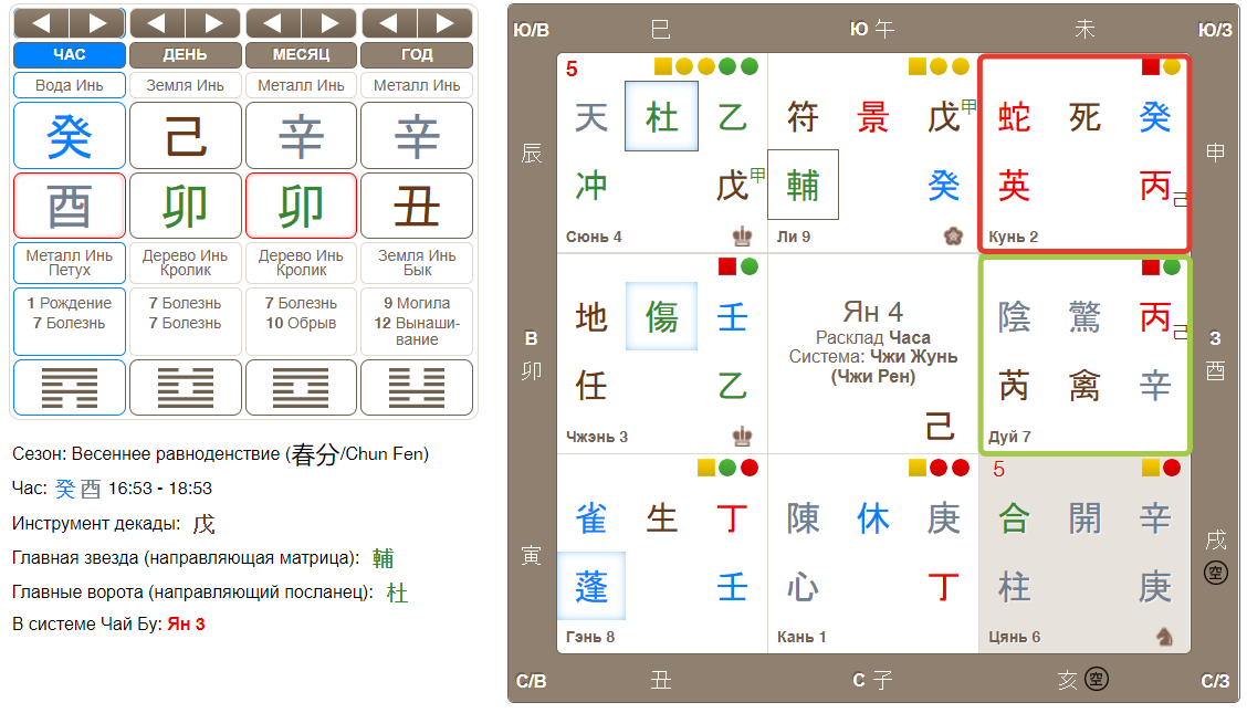 Несмотря на то, что мы знаем его данные по году и дню рождения, следует начинать рассматривать расклад с дня и часа. Дворец Кунь с небесным стволом часа порождает дворец Дуй с небесным стволом дня , дело порождает человека, лучше не придумаешь. Но внутреннее наполнение домов очень негативное. Во-первых, сам вопрошающий выпал в центр, скован в обстоятельствах, нет сил выполнить задуманное, находится без движения, так как фу инь врат. И дело также с плохими вратами, которые говорят об остановке, представляется нам иллюзией, которой пока не суждено сбыться. Главные врата и звезда направляют наш фокус внимания на то, что в данный момент времени он столкнулся с препятствиями, нужно набраться опыта, возможно получить дополнительное образование.