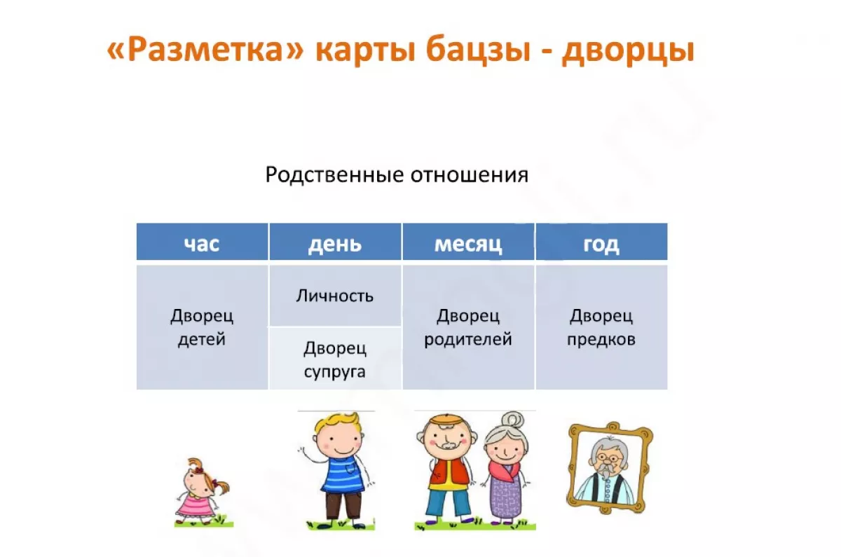 Как ориентироваться в карте бацзы? Давайте разбираться! Мы уже говорили о том, что каждый иероглиф – это не просто стихия, а какой-то из аспектов жизни. Также мы можем «назначить» иероглифам, кем из родственников он будет – папой, мамой, сестрой или дедушкой. Это зависит от Господина дня.