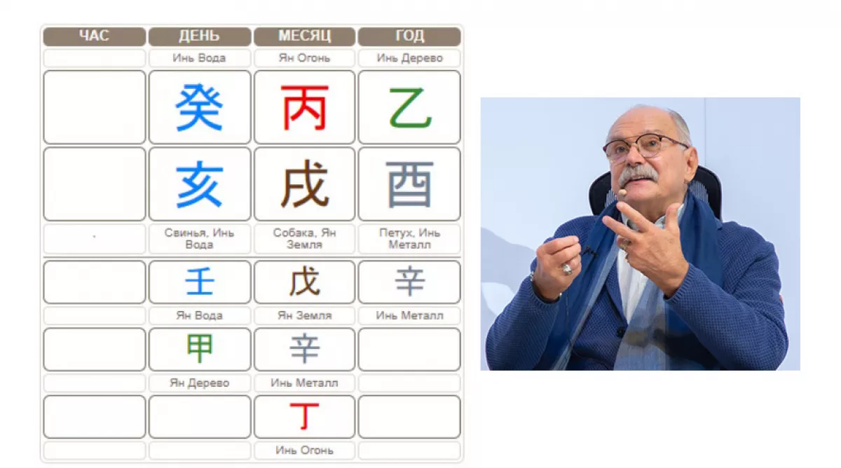 Бывают карты сложные или карты, где час рождения неизвестен. В этом случае важно изучить события жизни, чтобы сделать правильные выводы. Например, Никита Сергеевич Михалков – знаменитый советский и российский кинорежиссер родился 21 октября 1945 года в день иньской Воды, в месяц Собаки. Час рождения неизвестен. На одном из ресурсов карта рассчитывается как слабая, с полезными Металлом и Водой. Давайте посмотрим, так ли это?