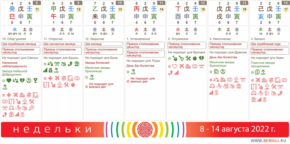 10 августа, среда. Годится для повседневных дел, завершения проектов и свободного расписания – не планируйте многого. Посещать заболевших друзей и медицинские центры не стоит. В этот день ша находится в центральном дворце, поэтому не забивайте гвозди, и не создавайте много шума в центре дома, так как это нанесет вред старшим членам семейства. Нарушение этого правила может привести к повреждению головы, глаз,рук и ног, к ожогам, несчастным случаям, судебным искам и спорам.