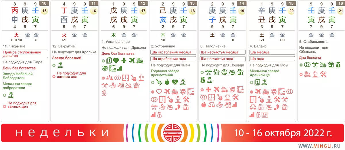 16 октября, воскресенье. Хороший день, пожалуй, самый симпатичный на неделе. За исключением посещения приболевших родственников. Можно планировать любые позитивные дела, особенно те, результат от которых вы хотите видеть еще долго. Поскольку день представляет собой дубликат к году (видите одинаковые иероглифы?), то осторожнее принимать опрометчивые решения надо тем, у кого в карте есть такой же столп – Вода Ян на Тигре.