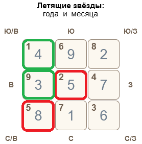 Северо-запад, с точки зрения летящих звезд не очень гармоничная комбинация, могут быть травмы ног, проблемы с суставами, печенью, головные боли. Аккуратно обращайтесь с режущими, металлическими предметами, особенно это актуально для мужчин, а также для тех, у кого гуа 3. Комбинация звезд может принести продвижение по службе, новые проекты, а также сильную загруженность, которая может привести к срывам. Могут быть конфликт с начальством, если у вас, например кабинет на северо-западе, или с вашим столом в кабинете формируется такая комбинация. Здесь месячное Ша – ремонт не делать.