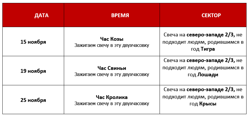 • Дни «разрушения» – 12, 24 ноября, 6 декабря особенно опасны для людей, у которых в карте уже есть столкновение Свинья -Змея.