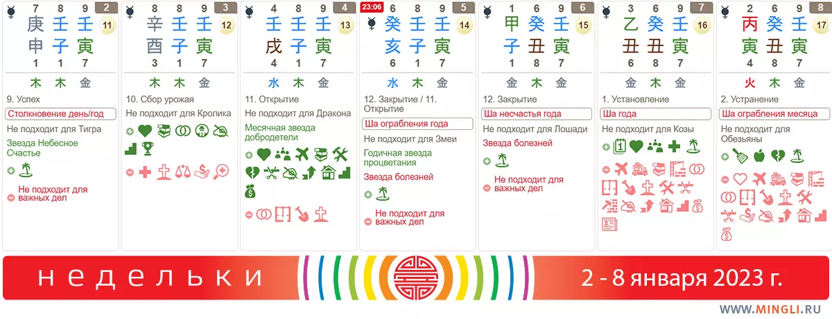 2 января, понедельник. Сегодня опять стоит проявлять осторожность, не вступать в конфликты, в первую очередь, если в вашей карте Бацзы есть Тигр и Обезьяна. Но, в принципе, столкновение сегодня не такое сильное, разумный подход и взвешенные действия помогут разрулить ситуацию. Важные дела планировать не стоит.