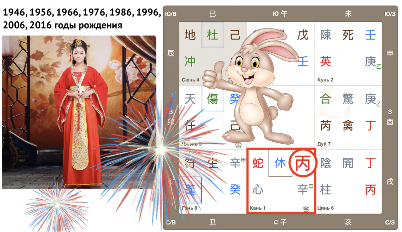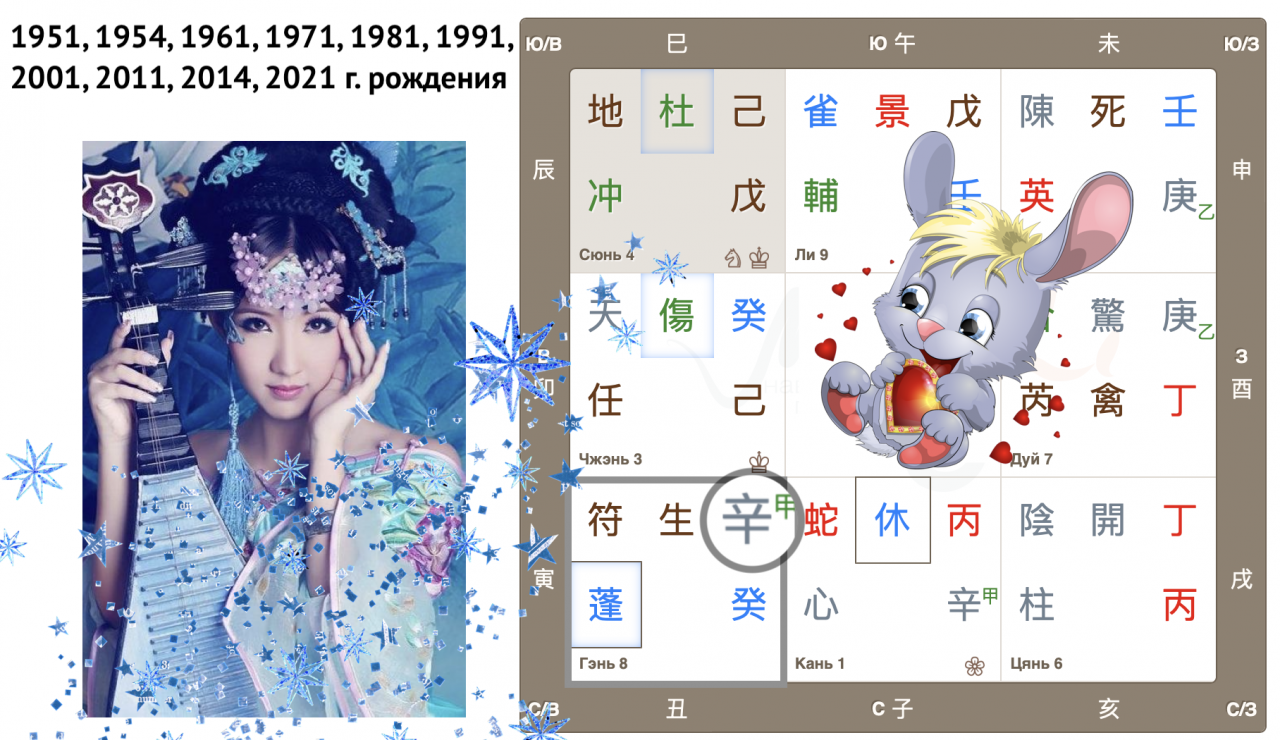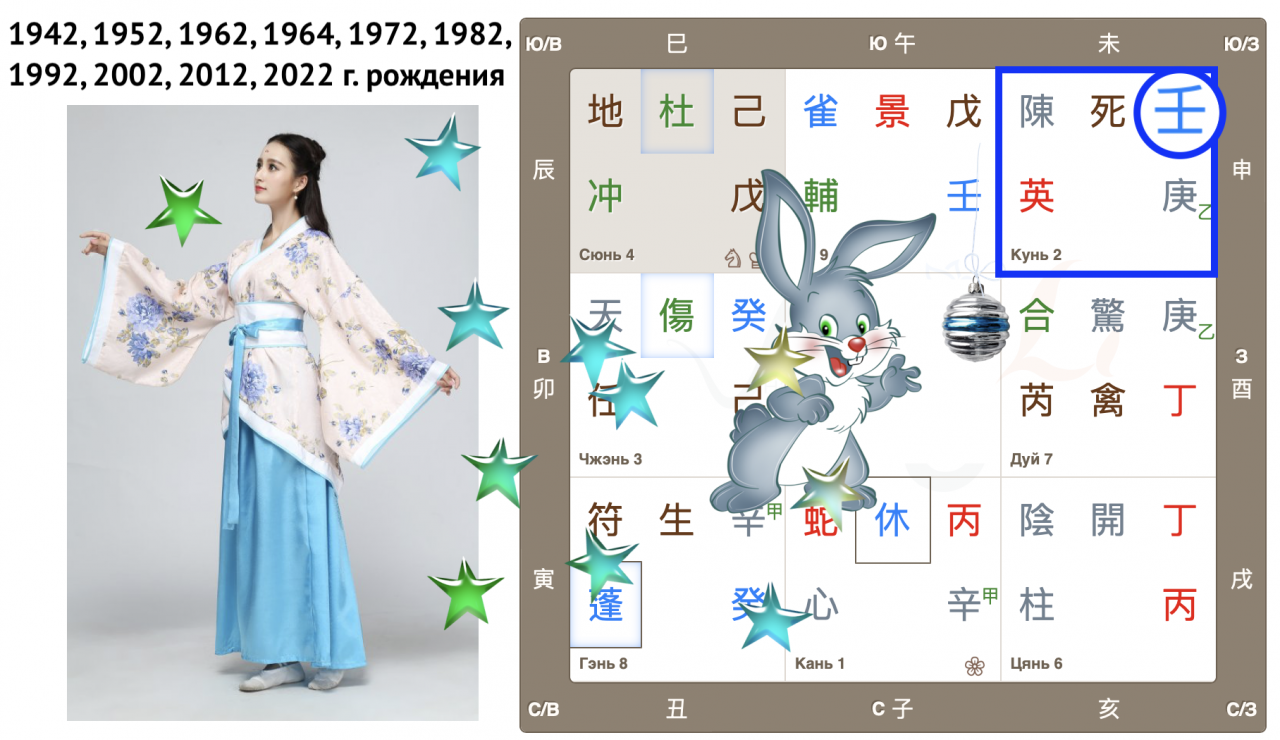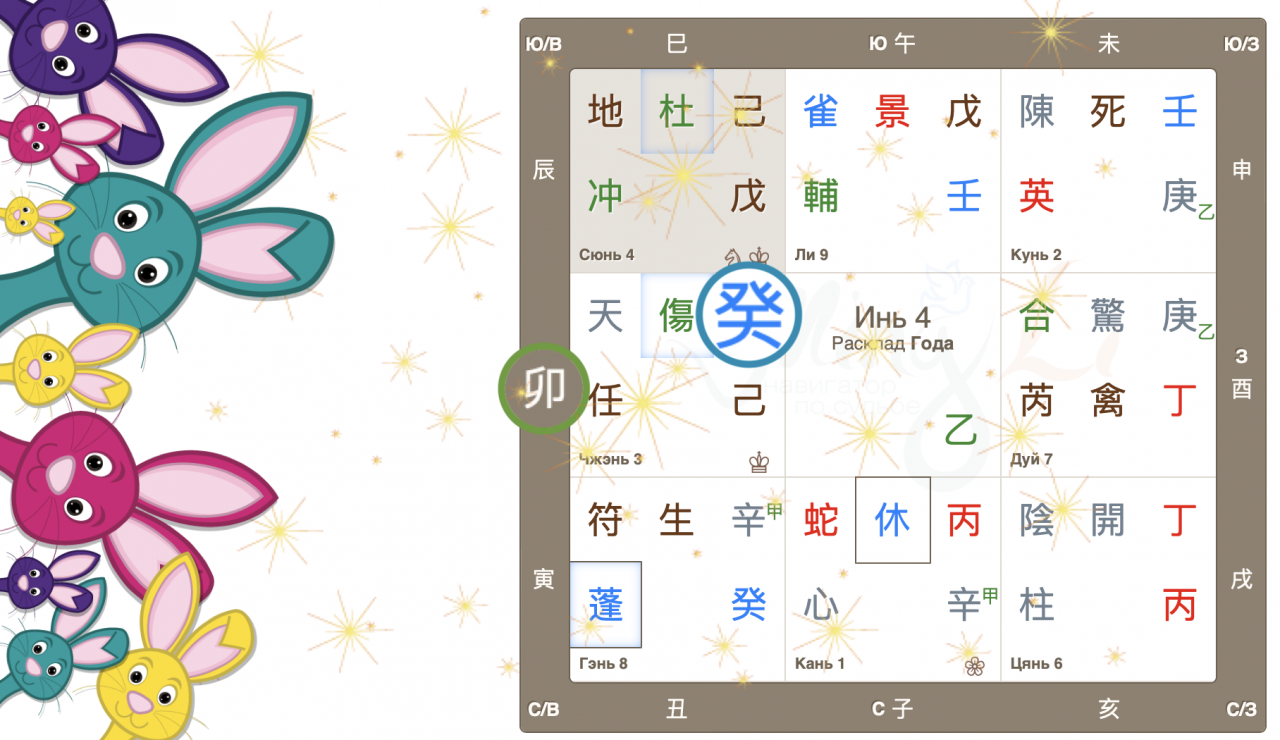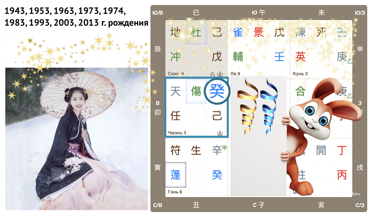 Как видим, Небесный ствол года Гуй (иньская вода) опустился в дом Чжэнь с Земной ветвью Мао (Кролик). Вот так сюрприз! Ствол и ветвь приходящего года в одном дворце, так случается далеко не всегда. Можем предположить, что влияние энергий года четко выражено, удвоено.