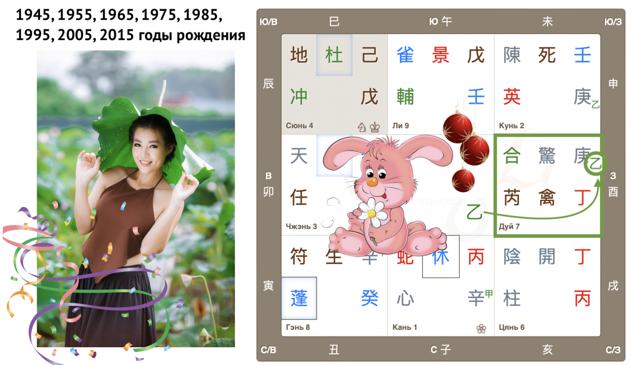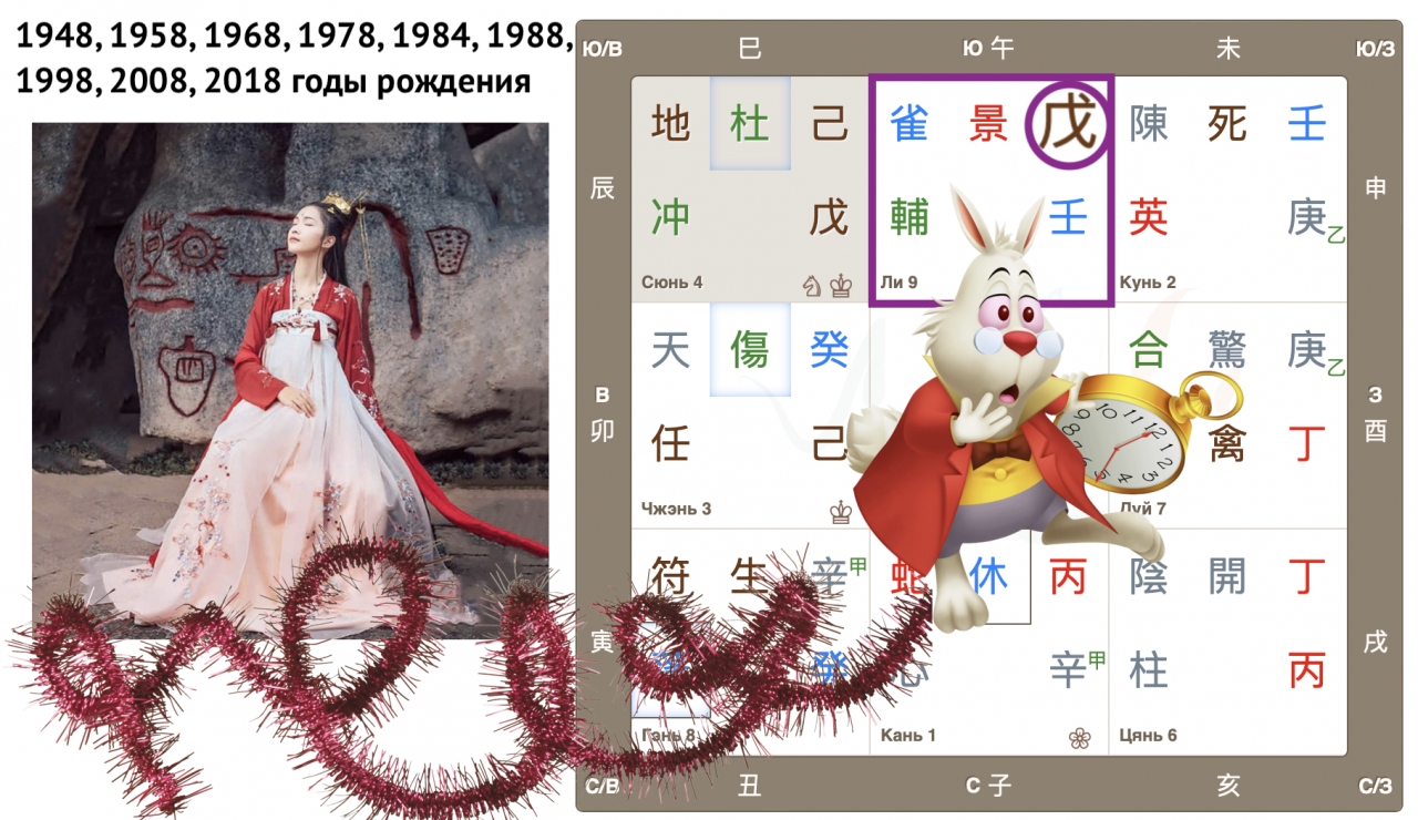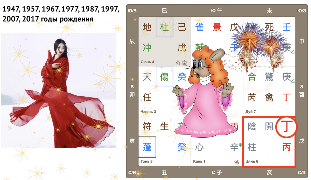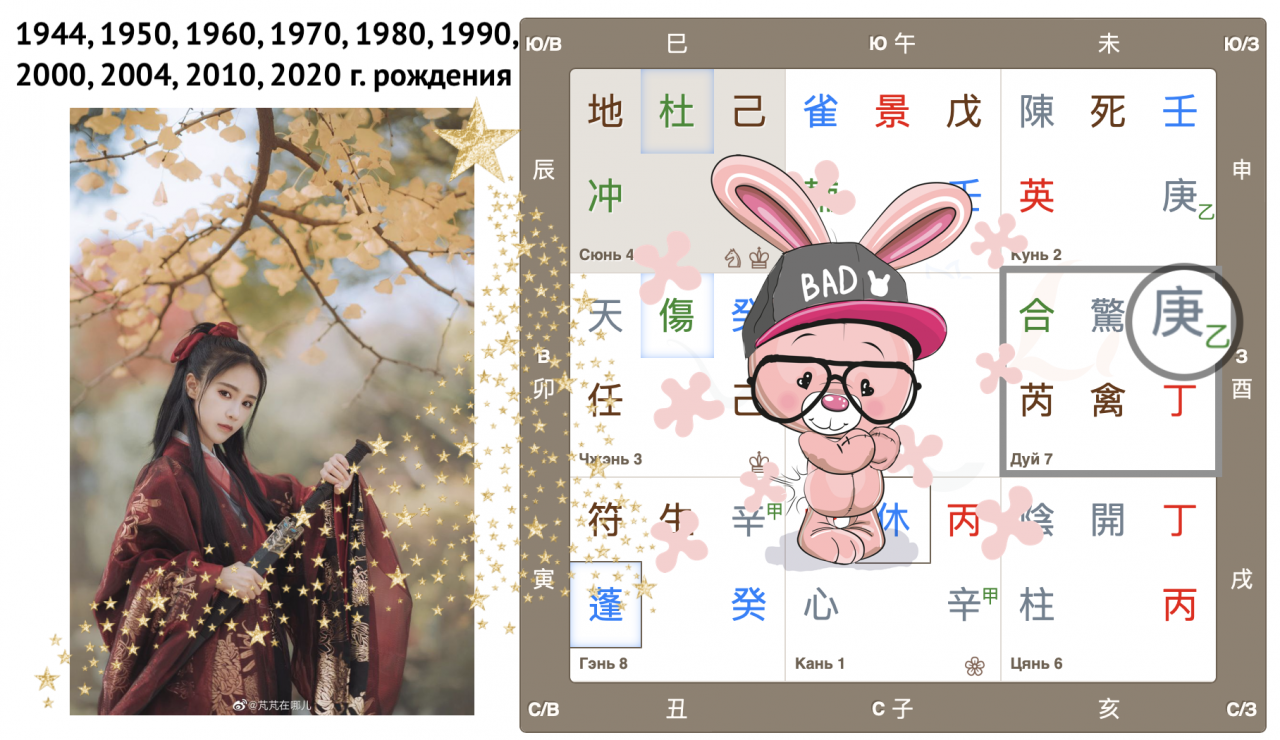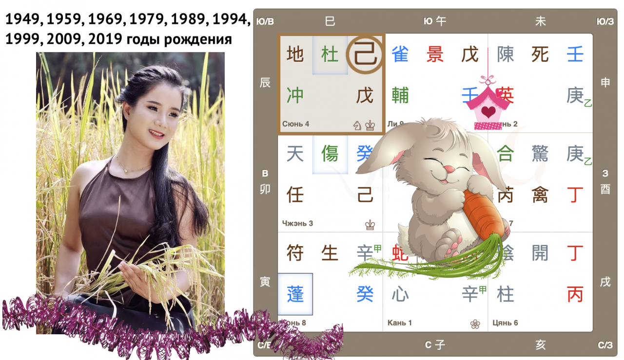 Как видим, Небесный ствол года Гуй (иньская вода) опустился в дом Чжэнь с Земной ветвью Мао (Кролик). Вот так сюрприз! Ствол и ветвь приходящего года в одном дворце, так случается далеко не всегда. Можем предположить, что влияние энергий года четко выражено, удвоено.