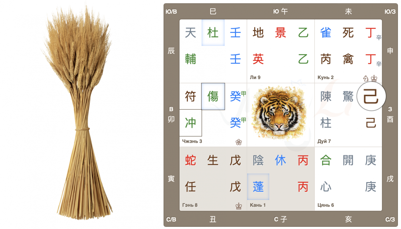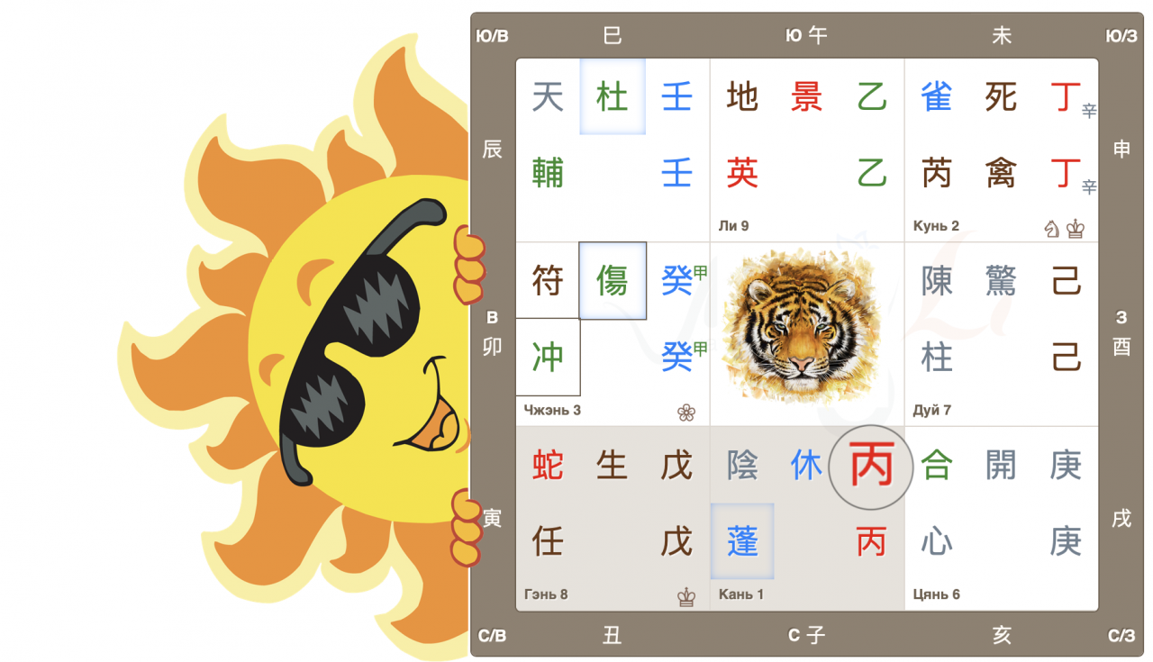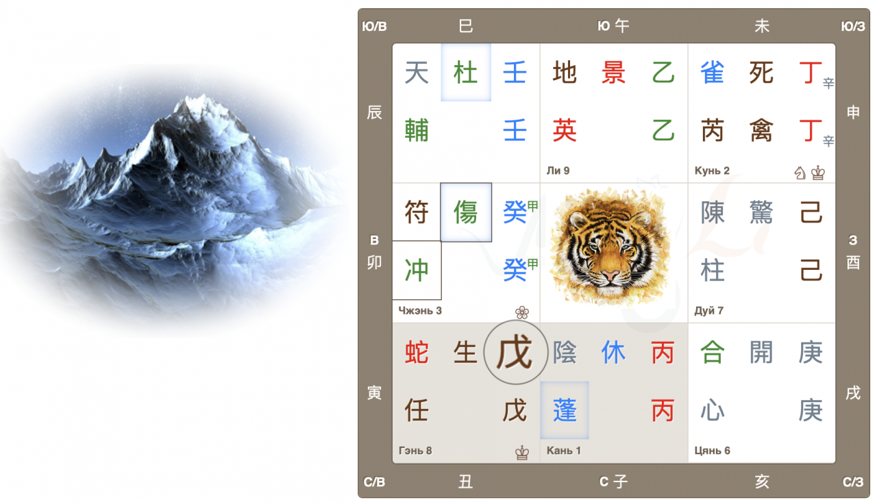 Дворец Чжэнь, движение Дерева, начало нового, быстрый рост. Врата ранения находятся в своем домашнем дворце и являются главными в раскладе. Это очень активные, азартные врата, жаждущие перемен, перемещений и поездок. Настала весна, время двигаться, и люди этого хотят. Да и родная звезда также добавляет мощный импульс для начинаний.