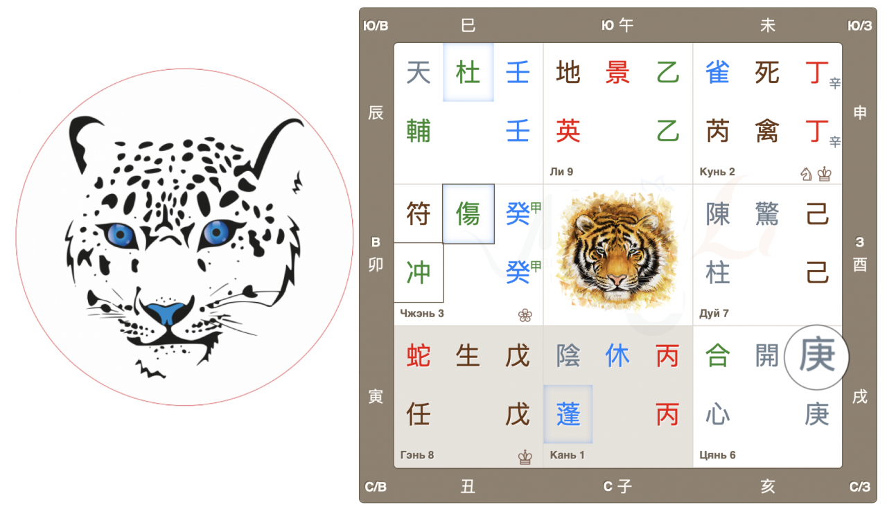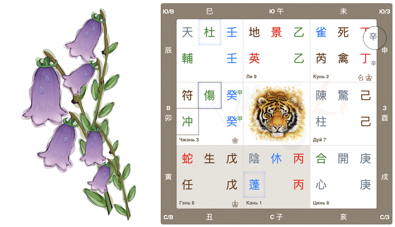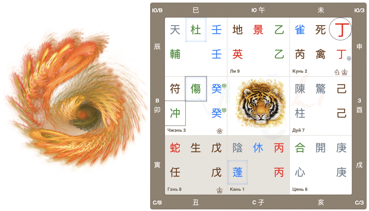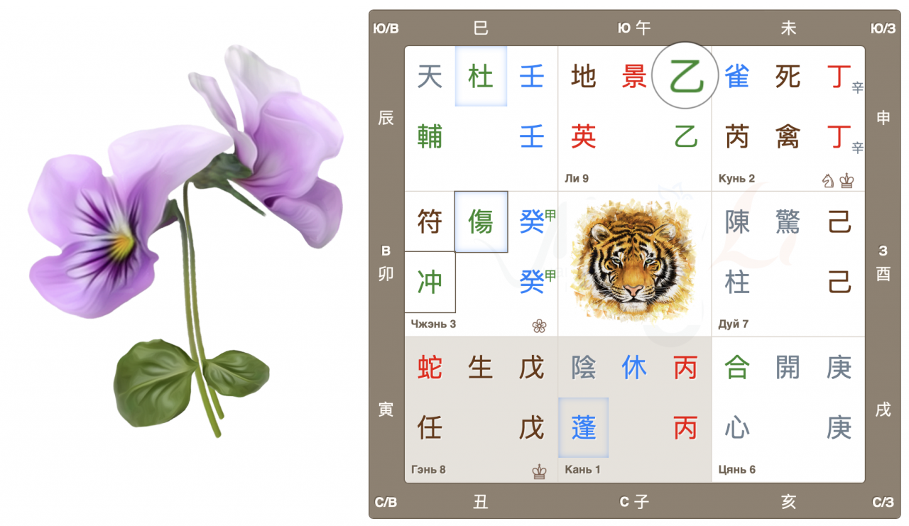 Дворец Чжэнь, движение Дерева, начало нового, быстрый рост. Врата ранения находятся в своем домашнем дворце и являются главными в раскладе. Это очень активные, азартные врата, жаждущие перемен, перемещений и поездок. Настала весна, время двигаться, и люди этого хотят. Да и родная звезда также добавляет мощный импульс для начинаний.