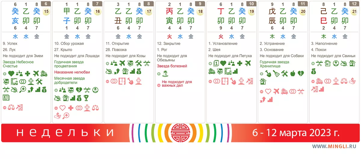 6 марта, понедельник. Очень благоприятный день, получающий благословение разных благородных звезд. Хороший день для свадьбы, начала бизнес-проектов, переезда в новый дом, путешествий, строительства. Если вы сделали что-то значительное в такой день, в течение 60-120 дней придет неожиданное богатство, вы получите помощь и поддержку благородных (полезных) людей. Очень благоприятно для исполнения планов. Вот просто брать – и делать. Исключения составляют те, кто родился в год Змеи и те, для кого Вода и Дерево категорически не полезны.