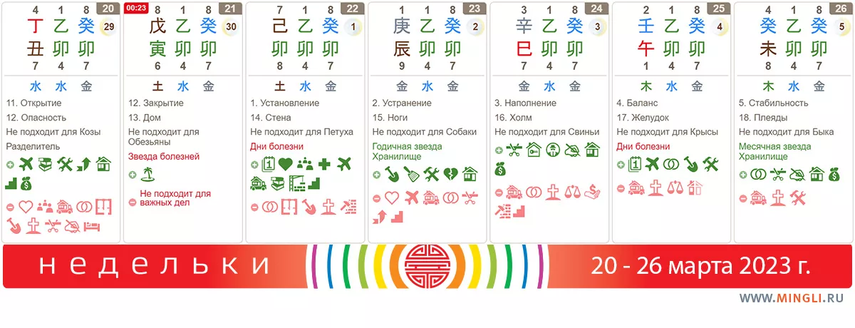 24 марта, пятница. Хороший день для путешествий, начала бизнеса и проектов, свадьбы, переезда в новый дом и других позитивных действий. Действия в этот день приведут к рождению долгожданного сына, хорошему урожаю и удаче в семье. Иньским Металлам, особенно слабым, а также Воде любой полярности, стоит обратить внимание на самочувствие, не переутомляться и не взваливать на себя лишнее.