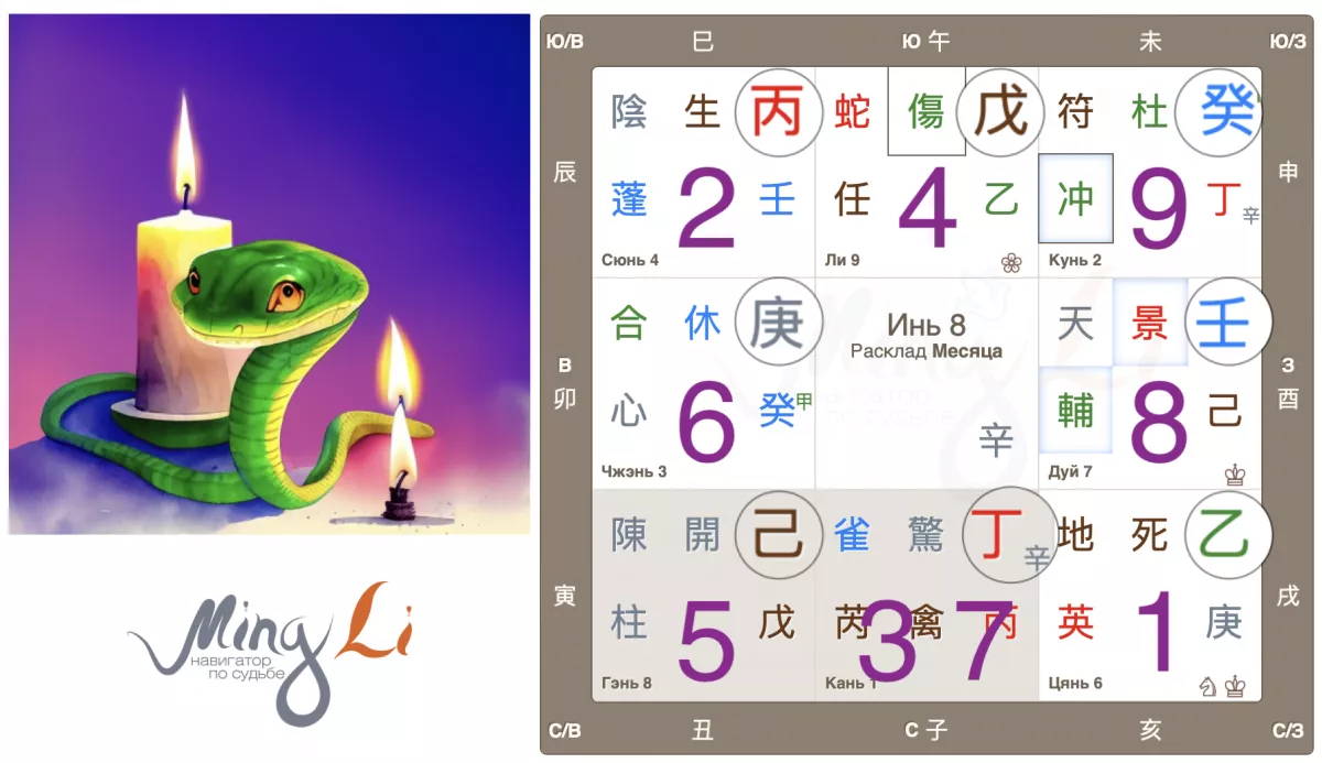 В раскладе Небесный ствол месяца Огонь Дин опустился в дом воды Кань, а вода гасит огонь. Сама по себе вода переменчива, порой неожиданна и может испугать, в то же время вода всегда стремится вниз, к покою. Разные денечки нас ждут в мае, тренировки на стрессоустойчивость в реальном времени. Можно реализовать такие «качели» через осознанный уход в «обрыв»: пара деньков вдали от всех и вся, а дальше можно снова в житейский океан забот. Земная ветвь месяца расположена в юго-восточном дворце Сюнь, который характеризуется движением Дерева. Все растет вширь, проникает, дует ветер перемен. Хорошее время для новых идей, роста и развития. Через стресс к развитию, через тернии к звездам. Звучит неплохо, как думаете, друзья?