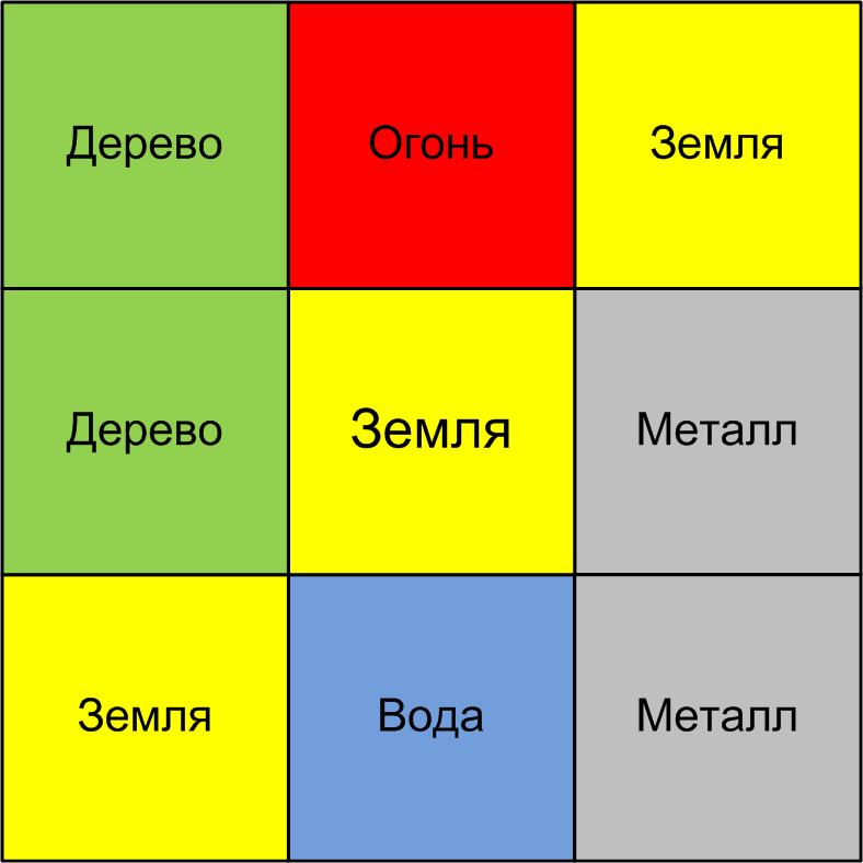 Каждый квадратик этой схемы можно отнести к определенной стихии – Воде, Дереву, Огню, Земле и Металлу.