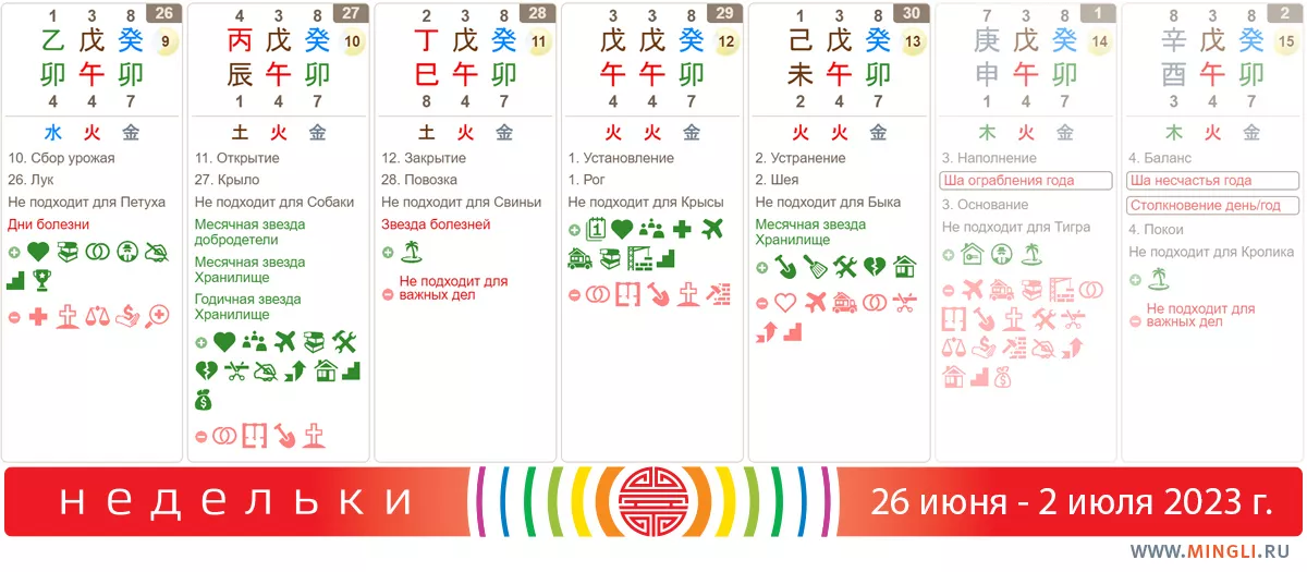 29 июня, четверг. Активные действия сегодня приводят к судебным искам, спорам, одиночеству, бедности и болезням. Дубликат месяца призывает нас к осторожности: если вам не полезны Земля или Огонь, в вашей карте есть Крыса или же столпы , , лучше всего не планировать на этот день ничего важного, не принимать судьбоносных решений, быть осторожнее за рулем и во время занятий спортом.