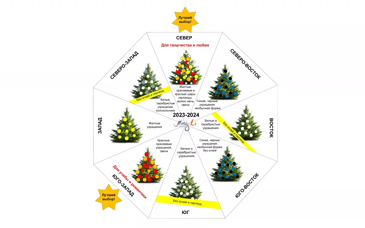 Точно НЕ стоит ставить мигающую яркую елочку на северо-западе и востоке! А также ДО 7 декабря не ставьте Ёлку с красными и желтыми шарами на юго-западе.