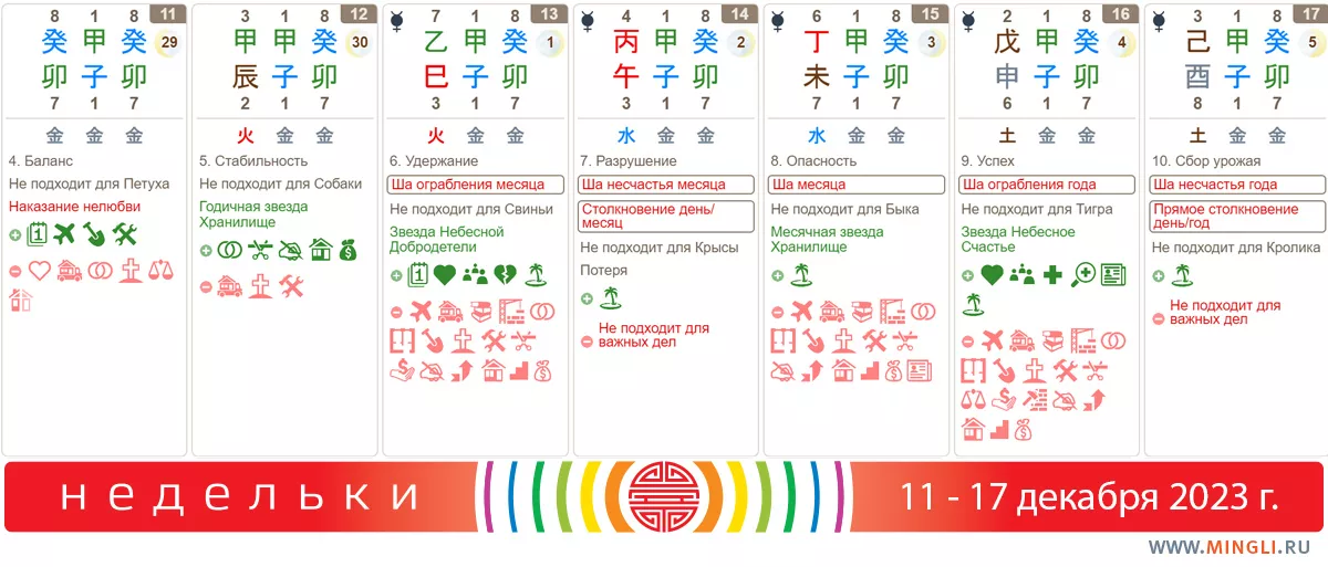 14 декабря, четверг. День является днем Четырех Потерь, поэтому, как говорится в китайских источниках «Все сделанное сегодня будет просто потерей времени». Конечно, обычными делами заниматься можно, но учтите, что день конфликтный – не пытайтесь выяснять отношения, будьте осторожны за рулем, не занимайтесь экстремальными видами спорта. Особенно если у вас есть Лошади и Крысы в карте Бацзы.