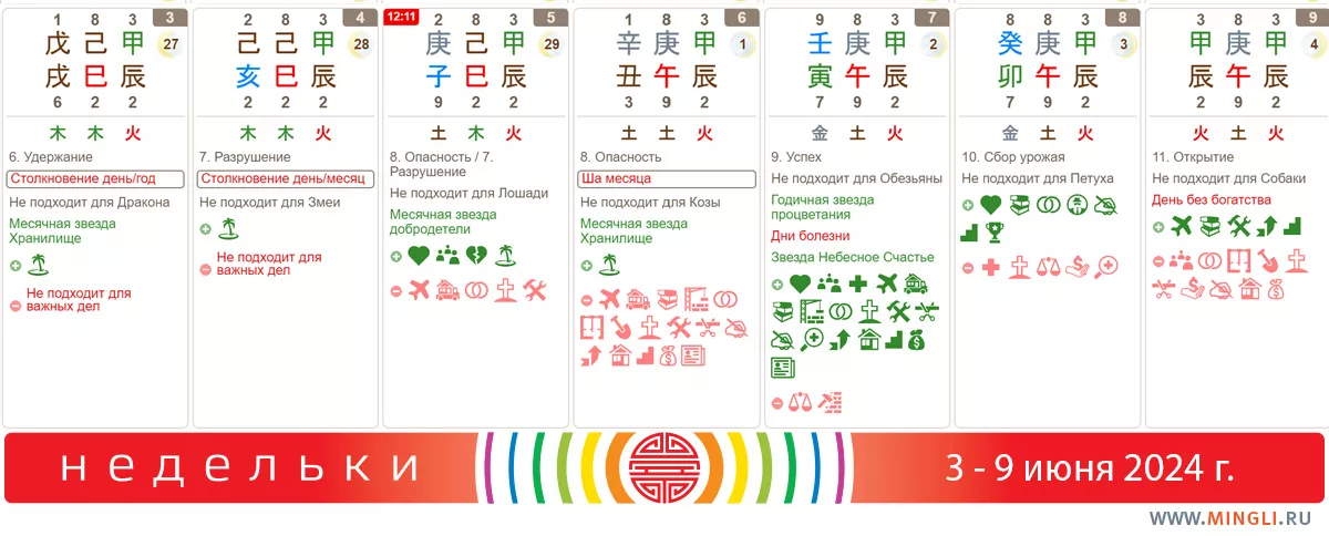 5 июня, среда. На первый взгляд день нормальный, но все зависит от того, когда в вашем городе меняется месяц. Как только Змея превращается в Лошадь, реализуется очередное Столкновение. Причем реализация может быть довольно жесткой, так как у дня и у месяца – одинаковый небесный ствол, янский Металл. Так что, если в вашей карте Бацзы есть , , или – сбавьте скорость, займитесь чем-то занудным и повседневным. Всем остальным это тоже не помешает; в любом случае, начало месяца+столкновение – не для супер-важных начинаний. Эмоции сегодня могут бежать впереди логики, перепроверяйте то, что сделали, чтобы не ошибиться.
