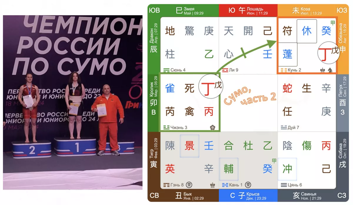 Накануне соревнований уже было известно, что у Маши будет две соперницы в ее весовой категории, обе они приехали издалека. Поэтому Машу я рассматривала в доме Кунь. Небесный ствол Земля Ян на земной тарелке прячется за стволом Дин, который прям закрывает нашу героиню своей грудью. Сам дворец Кунь по своему наполнению, как тот небезызвестный Карлсон с моторчиком – «мужчина в полном расцвете сил». Здесь у нас Джи Фу, обещающий поддержку в решающем поединке. Ворота отдыха счастливые, но слишком рано расслабляться, помним о гибкости и концентрации. И какие говорящие структуры здесь собрались! «Зеленый дракон сияет», «Нефритовая дева у дверей» – действуем, действуем! Правда, не обошлось и без ложки дегтя – мне больше нравится называть это частичкой Инь в Ян – речь о структуре «Змея борется и извивается». Однако структура полностью отражает смысл боя – извиваться и биться. Звезда Трава выступает индикатором риска, но с другой стороны, может просто и повезти. Напомню, что в предыдущий день у героини была легкая травма, но мистик Динь силен и готов, к защите своей подопечной.