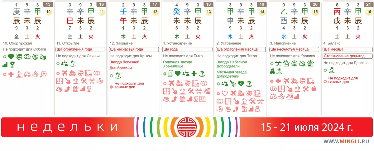 21 июля, воскресенье. Вот тут уж точно отдыхаем – и день медленный, и столкновение в наличии! Тренируем дзен, любим близких, пешеходов и других участников дорожного движения. Собако-Драконов просим беречь нервы и здоровье, особенно, если в карте Бацзы в наличии Быки.