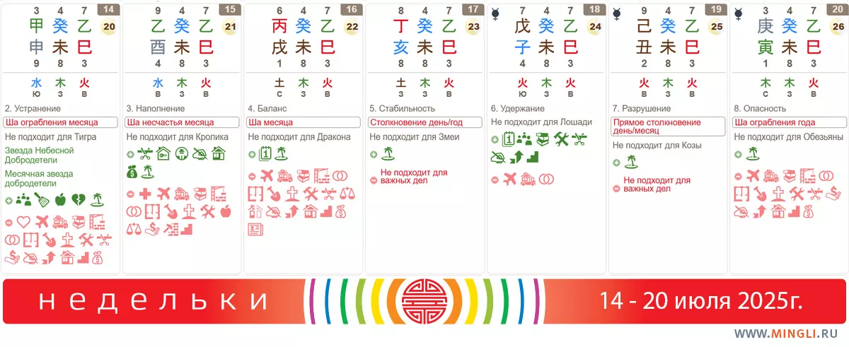 14 июля, понедельник. Лучше всего привести дела в порядок, распланировать неделю (учитывая, что с 18 июля нас навестит Ретроградный Меркурий). День сильный, с хорошим потенциалом, если вы придерживаетесь ограничений, которые приносят три ша: сегодня не стоит отправляться в путь, подписывать важные документы или делать спонтанные покупки/платежи. Не лучший день для начала бизнеса или регистрации компании – как сегодня, так и завтра. Янским Деревьям и Водам нужно позаботиться о своем здоровье. Тиграм день для великих свершений не подойдет.
