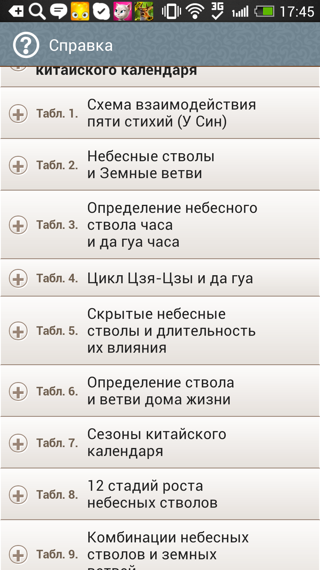 Во-вторых, в календаре появились удобные таблицы, начиная с У-Син и взаимодействия небесных стволов и земных ветвей, заканчивая Духами и Демонами, десятью Богами и Цзянь Чу (Управителями дня).
