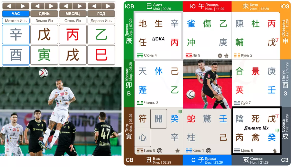 НС дня , представляющий команду хозяев - Динамо. опустился во дворец Цянь. Дворец по сезону силен. А вот команда , находящаяся на низких фазах, явно не будет блистать энергичностью. Структуры, ,  ,  - оставляют желать лучшего. Врата  Смерти не прибавляют хозяевам драйва и стремления к победе. Звезда Тянь Жуй явно дает понять, что ошибок не избежать в данном матче. Да и дух Тай Инь явно в таком окружении не будет помогать своим подопечным. Но тут есть Путешествующая лошадь, которая явно что-то принесет динамовцам в этой игре. Посмотрим.