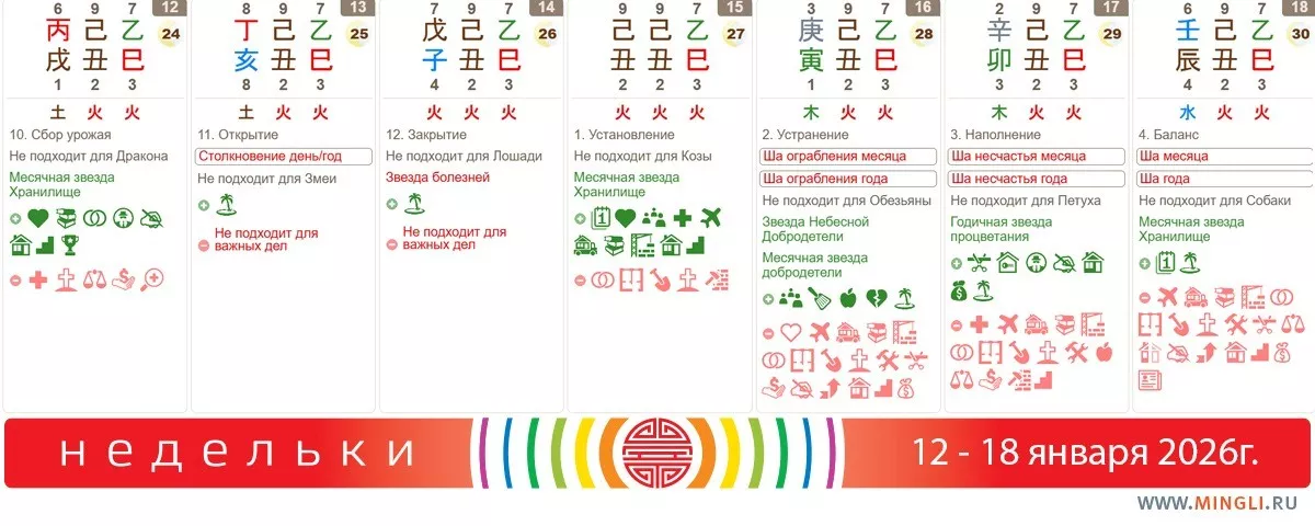 15 января, четверг. День неплохой, второстепенный по благоприятности для земляных работ, строительства, свадьбы, начала бизнеса и проектов, путешествий, переезда в новый дом, переговоров, свиданий, планирования. Козам он не подойдет. Внимательнее к этому дню стоит отнестись также тем, у кого в карте бацзы есть столпы (два иероглифа) - иньская Земля на Быке 己丑 и иньская Вода на Козе 癸未. Столп 甲子 (янское Дерево на Крысе) также сможет получить от дня интересный эффект. Если вы с недоумением смотрите на эти иероглифы - самое время начать осваивать науку бацзы! Вы сможете узнать больше о себе и своих близких и научиться основам выбора дат!