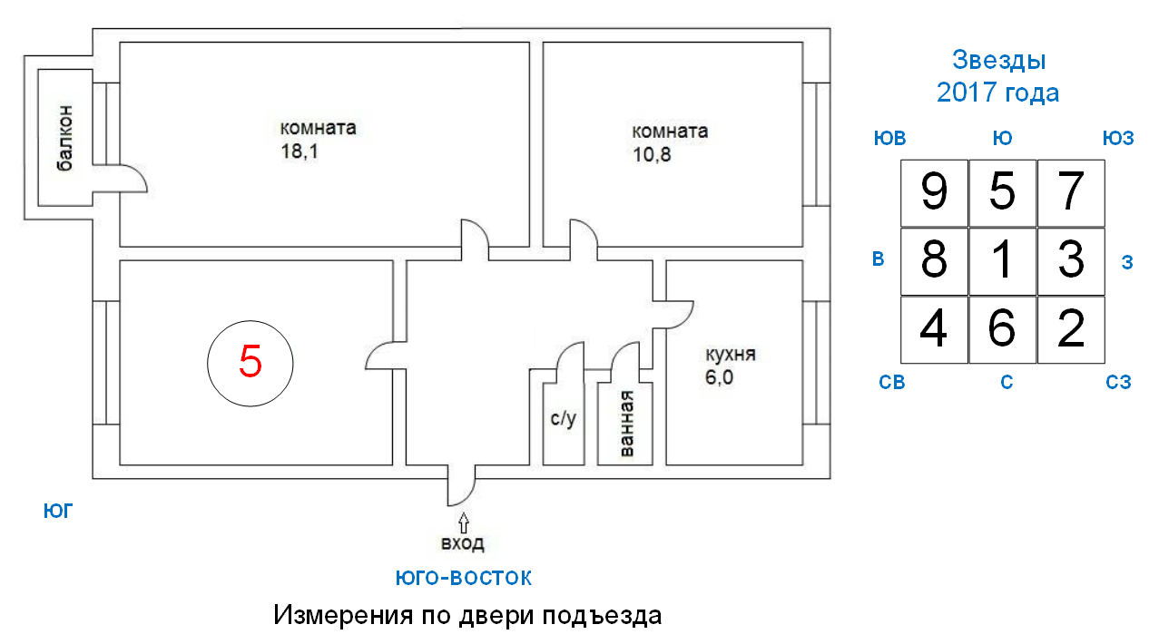 А потому, что карта звезд работает по двери подъезда, и на двери измерения показывают не восток, а юго-восток. Именно по этим измерениям надо строить карту звезд и распределять звезды года. Соответственно, в комнате, которую вы считали юго-восточной, с точки зрения звезд совсем не юго-восточные энергии! Там будут работать звезды, приписанные в карте к южному сектору, а, значит, в комнату прилетит та самая пятерка, которую стоит опасаться.