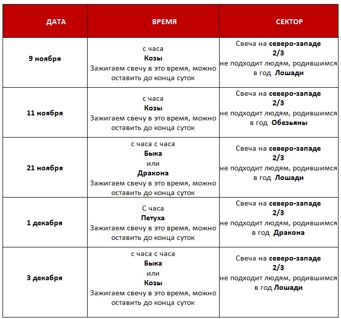 10, 22 ноября, 4 декабря. Все начатое в этот день множится. Можно подписывать соглашения и открывать бизнес, праздновать новоселье, собирать долги. Не подходит для свадьбы, подписания обременительных договоров, вступления в новую должность. Не стоит брать кредиты и начинать судебные дела. Не подходят для рожденных в год Козы.