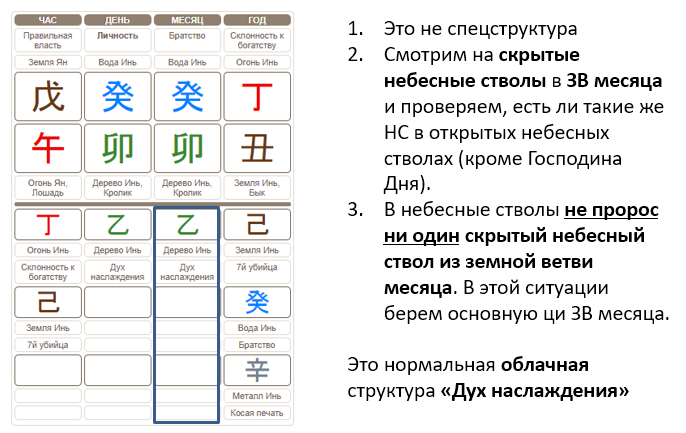 - Если же и их вы не нашли, то структура карты, характер и предпочтения человека не будут ярко проявлены. В этом случае мы будем считать богом, образующим структуру, основную ци, то есть первый скрытый небесный ствол в месяце.