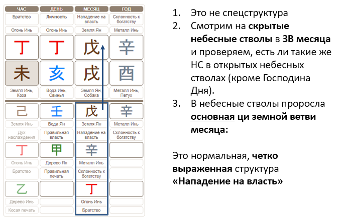 - Если верхний скрытый небесный ствол (основная ци месяца) не появился в небесных стволах карты, поищите в открытых небесных стволах оставшиеся скрытые небесные стволы. Они тоже могут образовать структуру.