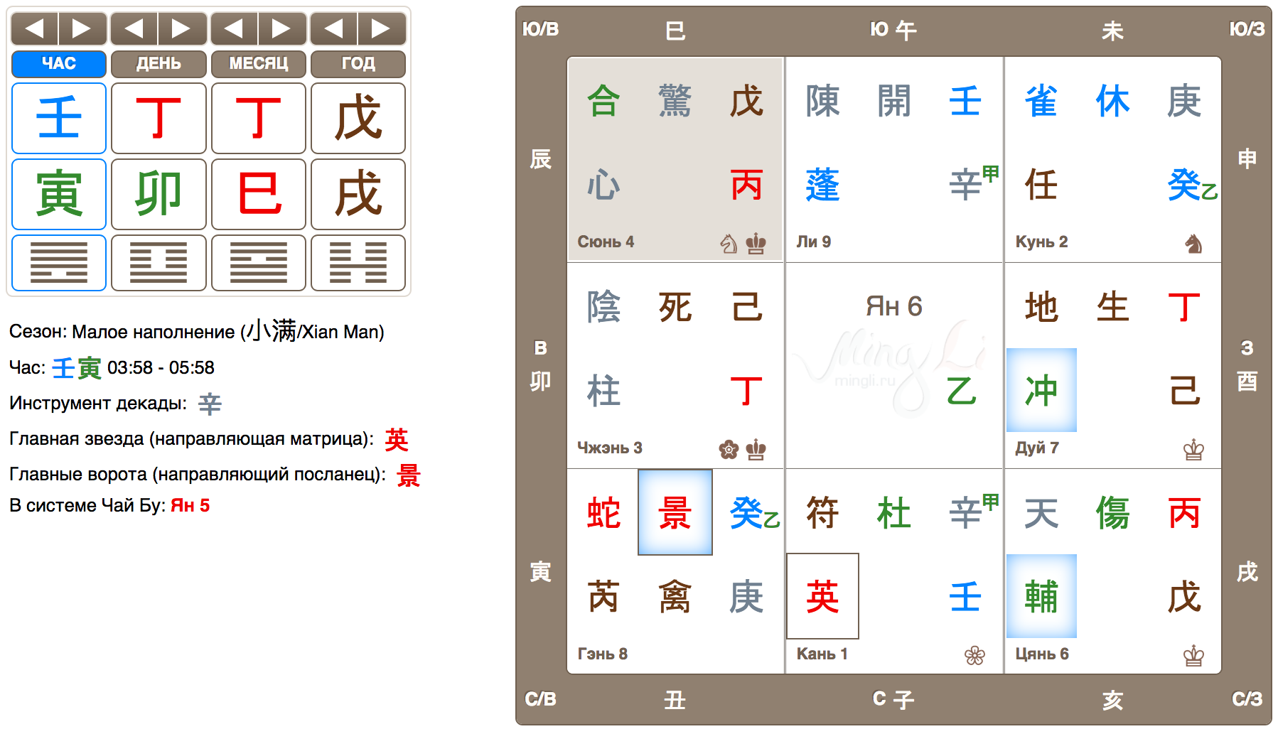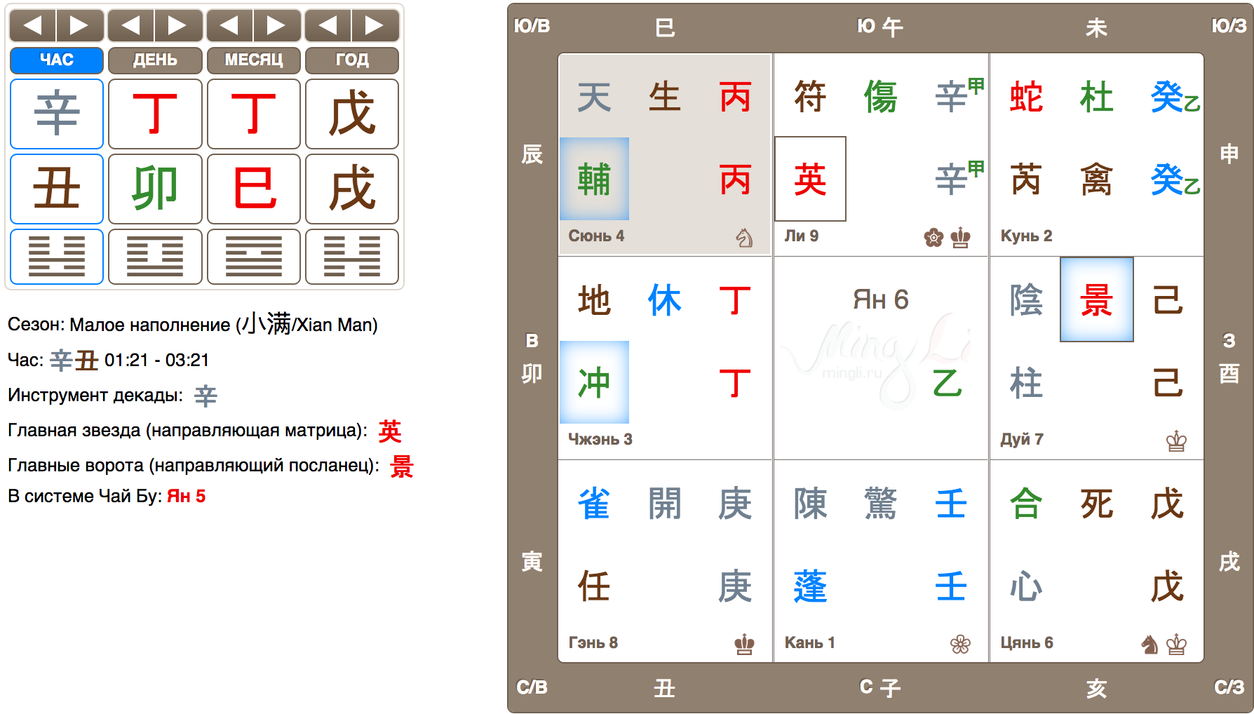 Небесный ствол Часа (дело) 辛 вместе с Главной звездой Небесный блеск 英 во дворце огня 離 Ли.