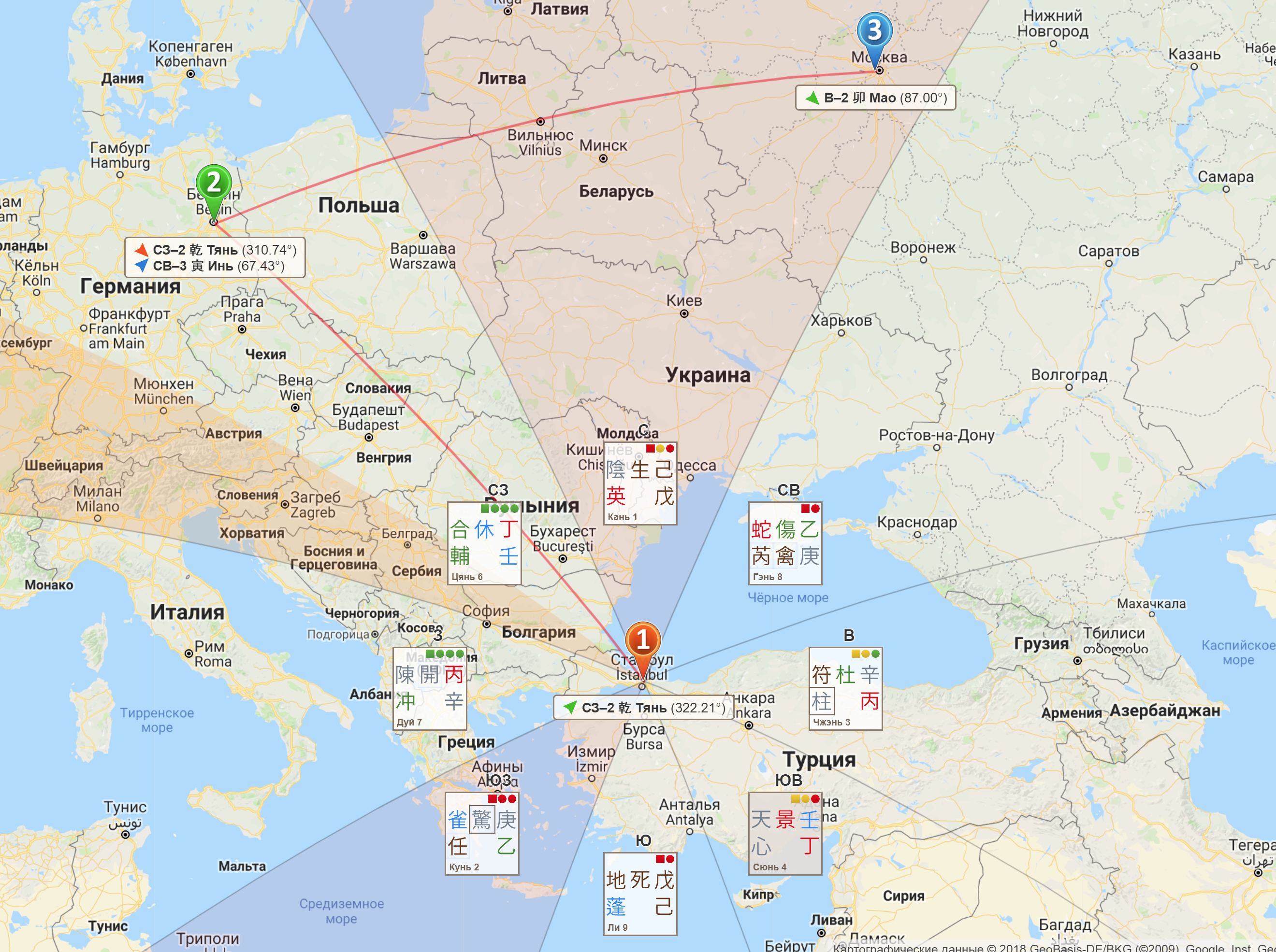 • Азимуты на сфере: учитывают сферическую форму земной поверхности при определении направления. Китайские мастера определяли и определяют направление по картам, не учитывая кривизну Земли. Вы можете поступать также, отключив азимуты на сфере. Кстати, используя кнопку «Радиус», вы можете менять протяженность секторов направлений на плоской карте. Однако, времена меняются и человек сегодня способен преодолеть огромные расстояния всего лишь за сутки-двое. В такой ситуации, особенно при движении ближе к полюсам, разумнее учитывать сферическую форму Земли, так как карта передает очертания и расположение материков с достаточно большими искажениями. Поэтому мы рекомендуем смотреть направления для поездок с учетом азимутов на сфере.